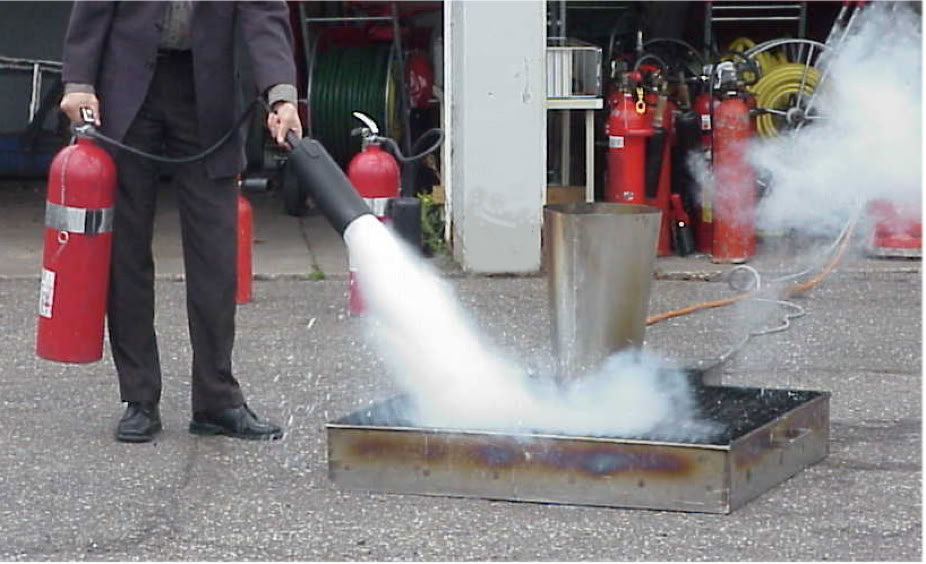 Praktisches Training mit dem Feuerloescher am Brandsimulator